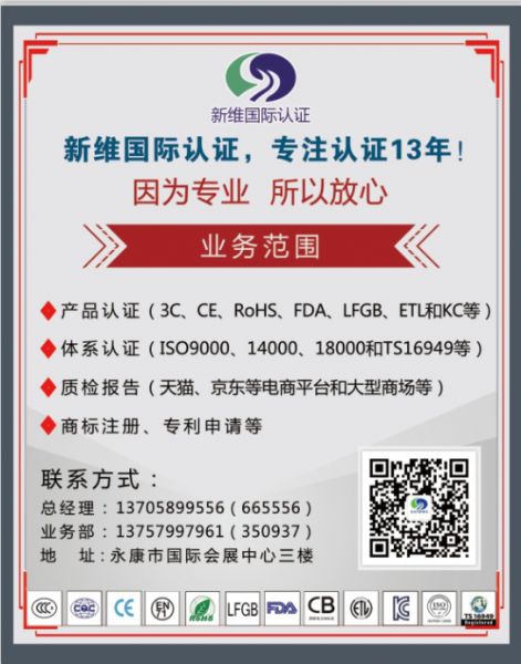 新維國際認證位于浙江永康市會展中心六樓,經(jīng)歷十五年風風雨雨,匯集成本地產(chǎn)品認證、體系認證和企業(yè)管理咨詢培訓(xùn)較大和較有實力的公司之一,業(yè)務(wù)范圍已經(jīng)擴展到全省,甚至到全國;公司擁有非常專業(yè)的認證專員、有實戰(zhàn)經(jīng)驗和專業(yè)的管理培訓(xùn)教練,公司擁有自己的檢測設(shè)備,方便產(chǎn)品預(yù)檢測。我們與德國TUV、瑞士SGS、英國ITS、法國BV、美國UL、中國質(zhì)量認證中心、中國中檢集團、中國家用電器研究院、國家玩具檢測中心、浙江立德、浙江方圓、北京中聯(lián)天潤和北京凱新等機構(gòu)建立了親密的合作伙伴關(guān)系。